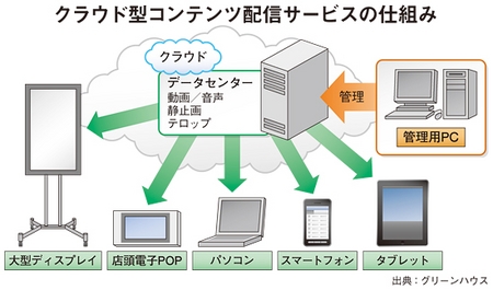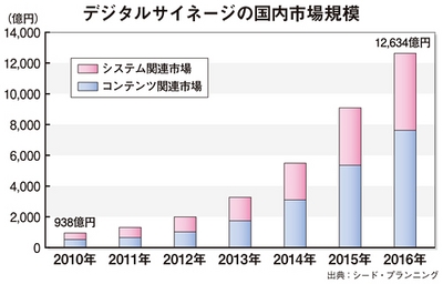 この屋外・屋内での利用は、今後も継続して拡大することが見込まれる。とくに、コンテンツ制作や配信サービスがビジネス拡大の決め手になりそうだ。調査会社のシード・プランニングは、国内デジタルサイネージ市場が2012年時点で2000億円規模になると見込んでおり、2016年には6倍以上にあたる1兆2634億円と予測する。1兆円を超える規模にまで膨れ上がる要因として、コンテンツ関連ビジネスがカギを握ると分析している。このような状況から、デジタルサイネージシステムを提供する際に、コンテンツ制作や配信サービスに力を注ぐITベンダーが多くなっている。とくに配信サービスについては、月額課金などのストック型ビジネスとして新しい収益源を確保しようとする動きがある。