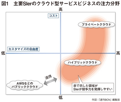 クラウド型ビジネスは、図1に示したように「パブリッククラウド型」と「プライベートクラウド型」に分かれるが、SIerの主戦場になるのは「プライベートクラウド型」から「ハイブリッドクラウド型」にかけてのゾーンであり、ハイブリッド型のほうがプライベート型よりも低料金であることを前面に打ち出して優位性をアピールしている。つまり、ハイブリッド型でどこまで魅力的なサービスを提供できるかが、サービス事業の優劣を大きく左右するわけだ。