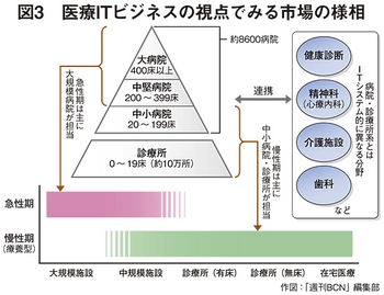 診療所の開業医が交代で病院医師を務めるなどの人的交流が深ければ、自分が受け持つ患者の診療履歴や検査データ、レントゲン画像などのデータを共有したほうが、業務効率が高まる。JBCCでは、もう一歩踏み込んで、在宅医療や訪問・巡回医療で使うiPadなどのスマートデバイスへの対応も進めている。図3に示したように、医療は約8600の病院を中核として、これを支える約10万の診療所、関連施設として健診センターや介護施設がある。急性期は大病院が主に対応し、慢性期は療養型の中小病院や診療所が受け持つ構図があって、JBCCが着目する在宅医療も慢性期医療の一つである。