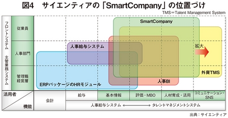 宮城県に本社を置くサイエンティアの「SmartCompany」は、人材情報のデータベース化から目標管理、人事評価、キャリア開発まで人材マネジメント全般を網羅する。最近、大手メーカーの技術部門からの引き合いが目立つという。とくに強みとしているのが目標管理。藤井取締役は、「日本企業の場合は期中の異動や兼務が少なくないが、『SmartCompany』はプロジェクト別に目標管理の評価シートを複数作成できる」とアピールする。職種や役職、商品、地域など、職務経歴は最大七つのキー(キャリアタグ)でデータベース化し、キャリアタグごとに検索できる。