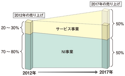 NIer各社は、従来型事業の規模が減少するなかで、今後5年間のサービス事業をエンジンとして、全体の売上成長率を20%レベルで伸ばそうとしている。