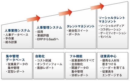 「ソーシャル・ネットワーキング・サービス(SNS)」「クラウドサービス」「ゲーミフィケーション」「モバイル」など、急速に業務システムに浸透しているこれらのキーワードも視野に入れる必要があり、外資系ERP(統合基幹業務システム)ベンダーがタレントマネジメントシステムにも適用し始めている。