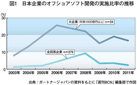 まず、(1)については、政治摩擦の影響はほとんどないとみられる。図1に示したのは、調査会社のガートナー ジャパンが調べた日本企業のオフショアソフト開発の実施比率の推移だ。日本のオフショア開発の約8割が中国で行われるものであり、この比率はここ数年ほぼ変わっていない。このことから類推すると、2005年に小泉純一郎元首相による靖国神社参拝が日中間に軋轢を起こしたり、2010年の尖閣諸島沖での中国漁船衝突事件に端を発した一連の激しい反日デモが巻き起こっても、日本のユーザー企業のオフショア開発とは、ほとんど相関関係がみられない。実施率の落ち込みが目立つのは2008年のリーマン・ショック時で、2012年はむしろ「オフショア開発は増加傾向にある」(ガートナージャパンの山野井聡・リサーチ部門代表)と予測されている。