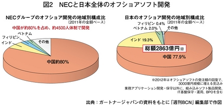 図2で示した通り、2011年の日本のオフショアソフト開発の総額は約2863億円で、うち中国は77.9%を占めており、圧倒的に多い。ガートナー ジャパンはオフショア開発の発注額が増加傾向にあることから2012年は再び3000億円規模に回復するとみている。NECのオフショア開発を地域別でみても、約80%は中国が占めており、残り約20%はインドやフィリピン、ベトナム、その他となっている。NECの山元正人常務によれば、「中国では約4500人体制でソフト開発に当たっている」といい、その規模の大きさがうかがえる。