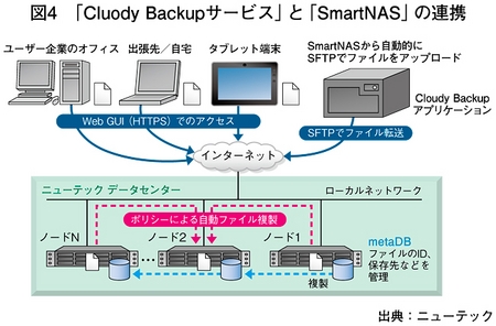 「Cloudy Backup」は、同社のストレージ機器「SmartNAS」との連携で利用できるサービス。ユーザー企業は、インターネット環境があれば、専用ウェブGUI経由でパソコンからデータのアップロードやダウンロードができるほか、「SmartNAS」に保存したデータを自動的にアップロードすることもできる。データ転送をSSH(セキュアシェル)で暗号化・認証することに加え、認証やデジタル署名などに使われるハッシュ値「MD5」の管理で、中身が異なる同一ファイル名を別ファイルとして保存して改ざんを防止するなど、セキュリティも確保している。利用料金は、50GBで月額3000円などと設定している。