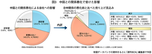 調査会社の帝国データバンクが10月下旬、全国2万2879社に対して行った調査によれば、日中関係の悪化によって企業全体の約3割が「悪影響を受けた」と回答し、自動車をはじめとする輸送用機械や器具製造ではおよそ6割、機械製造も5割余りが悪影響を受けたと答えている。日中関係の悪化による業績への影響の有無については、「わからない」と回答した24.6%の企業を除き、「何らかの影響がある」と回答した企業を母数として、今後の売り上げ見込みをたずねたところ、母数全体の33.6%が「減少」、52.9%が「変わらない」で、「わからない」が11.8%と回答。「増加」する見込みだとしたのはわずか1.7%だった(図3参照)