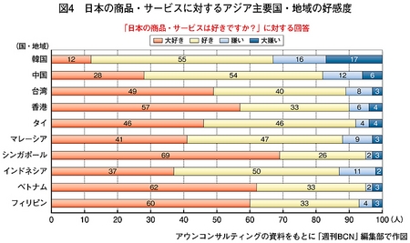 山田隆司社長 コンサルティング会社のアウンコンサルティングが、今年10月下旬から11月上旬にかけて、アジア主要国・地域で意識調査を行ったところ、反日感情が高まっている時期にもかかわらず、中国で日本の商品・サービスを「大好き」「好き」と回答した割合が100人中82人に達した(図4参照)。韓国を除き、台湾や香港、ASEAN主要国においても、軒並み中国以上の高い好感度を抱いている。日本の製品やサービスに対する期待度の高さの現れでもあり、このことには自信をもってビジネスを展開していくべきだ。同じ調査で「日本という国が好きですか」という質問に対して、中国は100人中55人が「大好き」「好き」と回答。この割合は、同じ政治的価値観を共有する韓国よりも実は高い。日中の政治摩擦が続くなかでも、中国の一般市民の反日感情が収まりつつある可能性はありそうだ。また、韓国を除き、アジア主要国・地域で8割方が日本の商品・サービスに対して「大好き」「好き」と高い好感度を抱いており、アジア成長市場が依然として、日本製品やサービスを受け入れる土壌があることを示しているといえる。