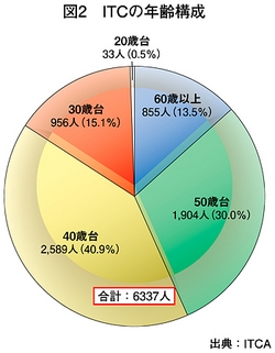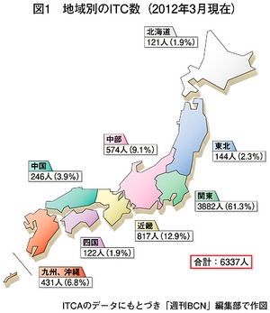 ITCAによると、2012年3月時点で、資格を取得し、活動しているITCは全国で6337人。その大半(61.3%)は、東京を中心とする関東地区を地盤としている。2番目に多いのは近畿(12.9%)。一方、最も少ないのは北海道と四国となっている(いずれも1.9%)。詳細については、図1を参照。