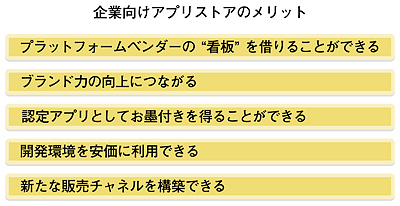 企業向けアプリストアは、コンシューマ向けのそれとは大きく異なる。商機に乏しいというよりも、別のシナリオを用意しなくてはならないからだ。