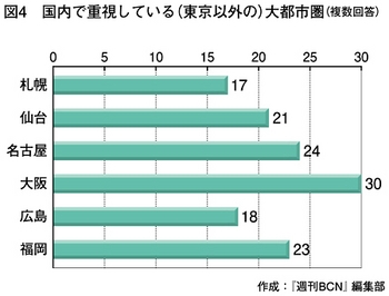 国内で、「ビジネス上、重視している(東京以外の)大都市圏はどこか」という質問に対しては、西日本に可能性があるとする回答が多かった。また、自動車メーカーの業績が回復しつつあることから、名古屋でのビジネス拡大に期待している声もある。