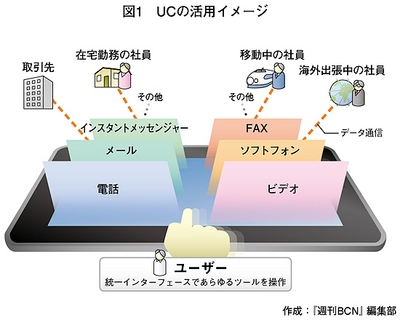 UCとは、電話やメールなど、社内外コミュニケーションのツールを統合する技術基盤のこと。固定電話やパソコンに頼らず、多数のツールを組み合わせることによって、場所を問わず、自由にコミュニケーションを取ることができる。最近は、専用機器が不要で、iPadなどのスマートデバイスで利用できるUC製品が登場している。高額だった導入コストも下がり、使い勝手がよくなっている。