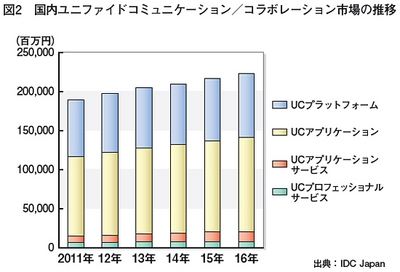 このように売り手が率先してUCを導入し、自社の経験を客先に判断材料として提供する動きが、マーケットを刺激している。調査会社のIDC Japanによると、国内のUC/コラボレーション市場は2016年までに年平均成長率3.3%で伸び、およそ2234億円に拡大することが見込まれている。