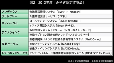 2012年11月、「SMART-Transport」は宮城県が復興支援の一環として認定する「みやぎ認定IT商品」に選ばれた。県が地元ITベンダー6社の製品を厳選し、販路拡大に関してベンダーをサポートするプログラム(図2参照)が功を奏したのだ。宮城県はこうした取り組みによって、ITベンダーの新規事業を後押しし、いちばんの課題である販売網の構築を支援している。