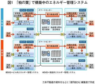 震災が発生し、多くの地域が停電したときも、柏の葉では電気が消えない。「スマートセンター」から、太陽光発電や蓄電池、非常用ガス発電によって、住宅やビルに電力を供給する。非常時でも、生活やビジネスの継続を図るのだ(図1参照)。