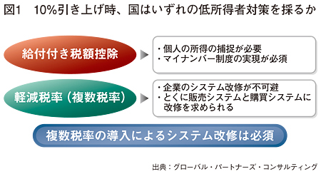 公認会計士・税理士 消費税法改正法には、逆進性対策の選択肢として両方が併記されているが、1月に与党がまとめた平成25年度税制改正大綱では、「軽減税率制度を導入することをめざす」と明記されている。こうした状況を踏まえ、グローバル・パートナーズ・コンサルティング取締役代表社員で公認会計士・税理士の高田正昭氏は「給付付き税額控除は個人の所得を把握する必要があり、さまざまな事務手続きの煩雑さを考えてもマイナンバー制度の実現が必須となる。しかし、この制度の運用開始は早くても10%引き上げの後なので、複数税率が導入される可能性はかなり高い」と指摘する。