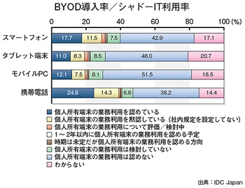 調査会社のIDC Japanでは、BYODの利用状況を調査して、「BYOD導入率」「導入課題」「メリットとデメリット」「生産性向上」などについて分析を行った。その結果、BYODの導入率とシャドーITの利用率は、スマートフォンで29.2%に達したほか、タブレット端末で19.3%、モバイル型パソコンで19.6%、スマートフォンを除いた携帯電話で39.1%になったという。しかも、シャドーITの割合は、BYODの導入を検討している企業を含めると、それぞれのデバイスで6~8割を占めている。IDC Japanの渋谷寛シニアマーケットアナリストは、「企業がBYODを導入する際、避けられない問題として浮かび上がってくるのがシャドーITだ。今後、スマートデバイスを業務で活用したいという社員が多くなればなるほど、シャドーITの存在は無視できないものになる」と指摘している。