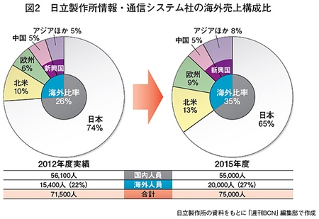 アジアの内訳をみると、中国は売上高構成比5%を据え置き、ASEANその他を8%へと伸ばす目標だ。年率20%を上回る勢いで成長している中国の情報サービス市場の伸びを考えると、日立の中国での売り上げ構成比を据え置く見通しは、それだけ中国でのビジネスを厳しくみていることになる。日立グループはITの分野で他社よりもむしろ積極的に中国ビジネスに取り組んできたことを考慮すれば、状況は楽観視できないことになる。