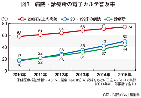 本部長 日立メディコの推計によれば、ベッド数200床以上の大規模病院の電子カルテの導入率は7割ほどに達しているが、200床未満の病院や診療所では30%前後に過ぎない。医療連携ネットをみても、大病院の情報を診療所が参照する構図が大勢を占める。今後、中小病院や診療所からの情報発信が活発化すれば、地域の医療サービスの水準が一段と向上するのは間違いない。