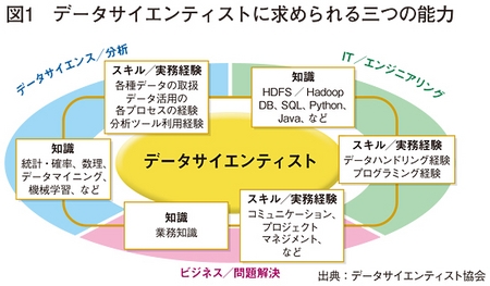 ●求められる三つの能力 そんなデータサイエンティストだが、実は、明確な定義がなされているわけではない。また、統計学や数理学など、ユーザー企業だけでなく、IT企業にとってもあまりなじみのない学問が関わってくるとあって、わかりにくい。