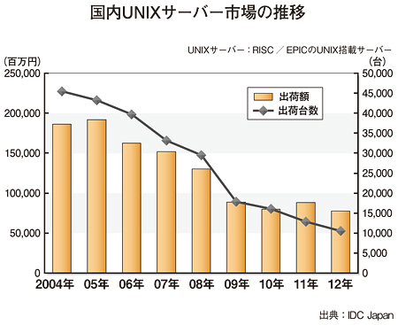 調査会社のIDC Japanが発表した2012年の国内サーバー市場規模は、出荷額が4453億円、出荷台数が55万台で、いずれも前年に比べて減少した。このうち、UNIXサーバーは800億円弱、約1万台を占めるが、前年比でいずれも下げ幅は市場全体のそれよりも大きかった。それでも、IDC Japanサーバーリサーチマネージャーの都築裕之氏は、「縮小傾向だが、金額は何とか持ちこたえているという印象」と説明する。