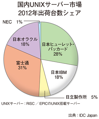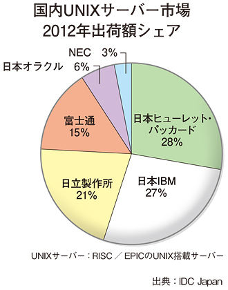 国内のUNIXサーバーベンダーは、メインプレーヤーが6社と少なく、採用しているプロセッサ/OS別に3陣営に大別できる。POWER/AIXの日本IBMと日立製作所、SPARC/Solarisの日本オラクルと富士通、Itanium/HP-UXの日本ヒューレット・パッカード(HP)とNECという構図だ(日立はHPから、NECはオラクルからのOEM製品もラインアップしている)。2012年の実績をみると、出荷額、出荷台数とも首位を獲得しているのは日本HPで、これを日本IBMが追うかたちになっている。