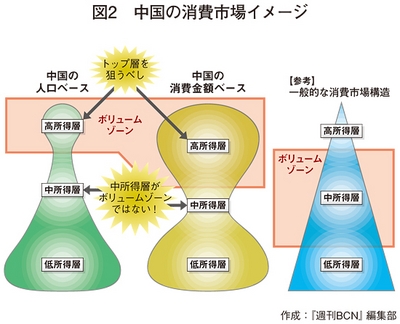 ヴィンクス上海法人の黄曉董事長は、中国消費市場について「ヒョウタン型」だと分析する。つまり、小売りや外食でまとまった金額を支払える消費者と、財力で大きく劣る消費者とが二分化して、ヒョウタンのような形になっているというのだ。あくまでも感覚的な印象と前置きしたうえで、「ヒョウタンの上の部分に相当する総人口の1~2割の人たちが全体の半分くらいの消費を賄っているのではないか」と推測。つまり、GDPを人数割りして平均を求めたような単純なボリュームゾーンを狙おうとすると、中国では最も消費者の少ない層に突き当たって、ビジネスはうまくいかないことになる(図2参照)。