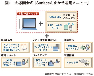 クライアント端末の需要増に「Surface」がどれだけ寄与するかが気になるところただ、SIerがタブレット端末を販売するにあたっての課題は、ユーザー企業がタブレット端末を管理・運用するうえでの問題だ。端末の初期設定から管理まで、タブレット端末をどのように管理すればいいのかがわからないという企業が多かった。そのため、敷居が高いと思うユーザー企業も少なくない。そうした問題を大塚商会が解決した。Surfaceの販売に際して、「Surfaceおまかせ運用メニュー」の提供を開始したのだ。
