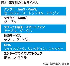 ●CEOの退任、大幅な組織再編 マイクロソフトを取り巻くビジネス環境は1990年代、2000年代よりも厳しい。競合の状況は、以前にも増して激しくなっている。定めた四つのメガトレンドのマーケットで、マイクロソフトは必ずしもトップに立っているわけではない。クラウドのIaaS/PaaSの分野では、アマゾンの勢いがすごい。SaaSではセールスフォース・ドットコムがいる。ビッグデータでは、エンタープライズ向けシステムで戦い続けているIBMやオラクル、ソーシャルではグーグルやフェイスブック、モバイルではグーグルとアップルがいる(図2参照)。意識しなければならないライバルが増え、追われる立場よりも追う立場にいるビジネスカテゴリが増えている。