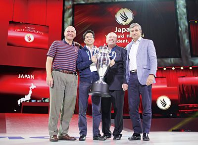 一昨年度はNo.1カントリーとして日本マイクロソフトが選ばれて、樋口泰行社長は米本社幹部の表彰を受けた(写真提供:日本マイクロソフト) ●大きな組織再編はなし 日本マイクロソフトが今年度期首に手を打った新たな施策は、大きく二つある。一つは、クラウド事業を推進するための新事業部門を社長の直轄に配置したこと。各部門を横断的にみて、クラウドをどう伸ばすかを考える組織で、昨年度までエンタープライズサービス事業を統括していた山賀裕二執行役常務を、この部門の責任者にしたことに樋口社長のクラウドに賭ける思いが現れている。そして、もう一つが「Surface」の販売責任を全営業担当者に課したことだ。クラウド(サービス)とデバイス事業を伸ばそうという意思がみてとれる。
