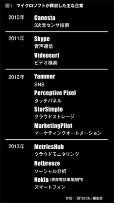 ここ数年の企業買収をみると、それがよくわかる(図1参照)。SkypeやYammerの買収は、ソーシャルを強化しようとする現れであり、提携関係にあったNokiaの携帯電話事業部門の買収に踏み切った事実には、モバイルで反撃に出るという意思がにじみ出ている。