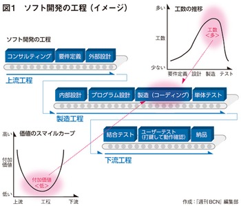 センタ長 ソフト開発の「価値のスマイルカーブ」と「工数の推移」でみると、「製造工程」は最も価値が低く、最も工数が多い。つまり、極論すれば価値の低い作業を、多くのエンジニアを投入して行う労働集約的な行為であり、人件費の押し上げと粗利益の低下に直結してしまう。ここにメスを入れない限りは、抜本的なコスト削減は難しい。「上流工程」は付加価値の高い工程なので、多少のコストがかかっても採算性は良好とされ、「下流工程」は投入する人数の絶対数が限られている。
