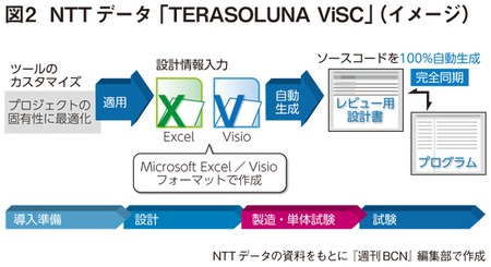NTTデータはプログラムソースコードを自動生成する「TERASOLUNA」シリーズを独自に開発し、設計から製造、単体テストまでの製造工程の自動化にめどをつけた。「最も価値の低い作業に、最も多くのエンジニアを投入する」製造工程の主要部分を簡略化する、あるいは、なくしてしまうことでコスト構造を抜本的に変えようという取り組みである。