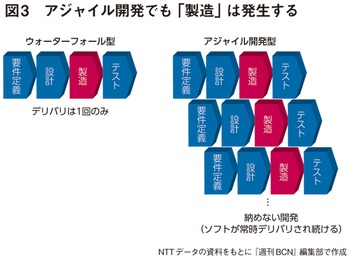 ウォーターフォール型は、「要件定義→設計→製造→テスト」までを1回の工程で完結させる手法だが、アジャイル開発型は同様の工程を何度も繰り返しながら完成度を高めていく手法だ(図3参照)。ウォーターフォール型、アジャイル開発型ともに基本的な工程は同じであり、1回で終わらせるか、何度も繰り返して、成果物であるソフトウェアを常時デリバリする方式かの違いである。