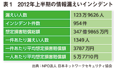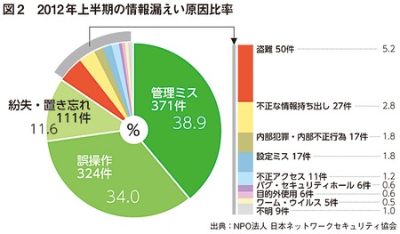 そうしたなかで懸念されるのが、一般企業の対応だ。マイナンバーはすべての企業にかかわってくる。社員とその家族のマイナンバーを管理し、税金や年金、保険関連の事務で付番することが求められているからだ。しかし、実態はどうか。日本ネットワークセキュリティ協会(JNSA)によると、2012年上半期の個人情報の漏えい人数は123万9626人、件数は954件だった(表1)。漏えいの原因は、管理ミスが38.9%、誤操作が34.0%となっており、情報漏えいのリスクは内側にあることを示している(図2)。行政機関に比べれば扱う個人情報の絶対数は少ないものの、一般企業においても漏えいのリスクを把握しておくべきだ。