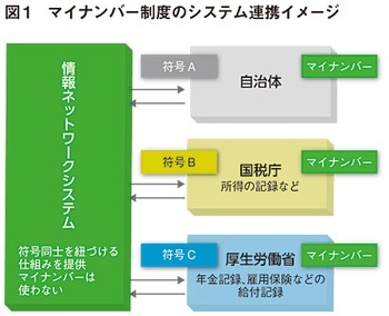 住基ネットの頃から制度への反対意見として「情報が芋づる式に取られてしまう」という懸念がある。これはマイナンバー制度でも必ず出てくる。公共機関に加えて民間企業でもマイナンバーを扱うだけに、その懸念は当然だ。ただし図1にあるように、各団体とのデータ連携にマイナンバーは使われない。使われるのは「符号」と呼ばれるシステム連携用の番号である。符号は団体ごとに異なっているうえ、表には出ないので、マイナンバーが他人に知られたとしても、個人情報を芋づる式に入手することは簡単ではない。