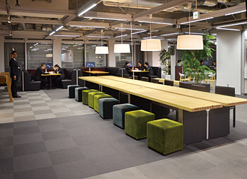 オフィス事業本部企画部の矢野直哉部長は、「当社は働きやすいオフィス環境づくりのソリューションを販売している会社。自らのオフィスを自慢できてこそ、お客様にも魅力を伝えることが可能になる。実際に当社のオフィス空間を構想したのは社員たちだ」と説明する。例えば、フリーアドレスである。営業部が働くフロアでは、すべての社員が特定の席をもたずに、その日その日に自分の席を決めて仕事をこなす環境を整備している。各社員が個別にもつノートパソコンなどのツールは、小型のロッカーに収納する仕組みになっている。