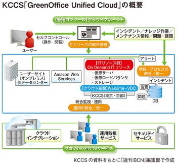 左からKCCSの萩元大作課長、秋枝正治本部長、長澤宏起部長 ●「中核技術」は社内に蓄積 サービスと一体となったトータルな価値(あるいはコスト)で競争を挑むのは、コアだけではない。京セラコミュニケーションシステム(KCCS)も、トータルコストに着目してクラウドサービスを構築・刷新しているSIerだ。KCCSは東京と京都にラック換算で総計700ラック規模のDCを運営しているものの、やはり規模の競争では見劣りがする。そこで打ち出したのが、独自に開発した管理運用システム「クラウドマネージャ」を活用したクラウドサービス「GreenOffice Unified Cloud」だ。