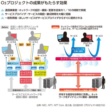 NEC、NTT、NTTコミュニケーションズ(NTT Com)、富士通、日立製作所の5社が、2013年、共同で研究開発プロジェクト「O3(オースリー)プロジェクト」を立ち上げた。総務省の委託研究「ネットワーク仮想化技術の研究開発」で5社の提案が採択されたもので、国の予算を使い、日本を代表するITベンダーがスクラムを組んだナショナルプロジェクトだ。ネットワークSDNを広域ネットワークに適用しようとする世界初の試みで、2013年に国が新たに定めたIT戦略「最先端IT国家創造宣言」で重点施策に掲げられている「ビッグデータ活用推進」に関する技術開発の核となる事業でもある。プロジェクトが目指すもの、そしてその成果がITベンダーにどんな影響をもたらすのかを探った。(取材・文/本多和幸)