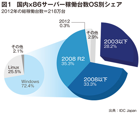 ITベンダーは、2014年4月9日にサポートが終了する「Windows XP」の移行支援に全力を傾けている。しかし、サポートが終了するのはWindows「XP」だけではない。今のところはまだあまり騒がれていないが、15年7月14日には「Windows Server 2003」のサポートも終了することになっている。国内法人市場には、いまだ多くの「Server 2003」が稼働しており、サーバーOSの移行に要する期間がクライアントOSと比べて長いことを考慮すれば、現時点でも十分な時間的猶予があるとはいえない状況だ。移行を進めるうえで浮上する課題は多い。それに対してITベンダーはどのような対処をすべきかを追った。(取材・文/真鍋武)