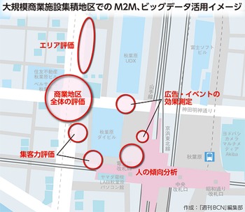 Amazonはそれそのものが巨大な商業区域に匹敵するほどの規模であり、なおかつ「綿密なビッグデータ分析によって、新しい商品をレコメンド(推奨)し、次の購買につなげている」(SIer幹部)。これでは、多くの小売業がAmazonをはじめとするネット勢力に屈するのは時間の問題だろう。M2M・ビッグデータは商業区域全体にセンサデバイスを張り巡らせ、Amazonと同等、あるいはそれ以上の情報に基づく分析を行うことで、勝ち残りをかけてネットに対抗していく強力な武器になる。