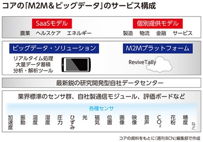 コアは、「M2Mスタートアッププラン」によってM2M活用の敷居を低くする一方で、13年10月に自前で最新鋭のデータセンター(DC)を首都圏に竣工。独自にM2Mとビッグデータの研究を本格化させている。画像や温度、振動、加速度、花粉、糖度、位置、光、ひずみ、音声など、あらゆるセンサから収集した情報を自社DCに構築したM2Mプラットフォーム「ReviveTally」に集約。これにビッグデータ分析を加えて、ユーザーに役立つ情報を生成する「M2Mとビッグデータの一大拠点」(DC運用を担当するコアネットインタナショナルの吉原清彦社長)として機能させていく。