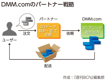 そこで、DMM.comは、3Dプリンタビジネスを検討しているIT企業に対して、パートナーシップを提案している。「当社のウェブサイトと連携するためのAPIを提供している。パートナーに、自社で製造受託を請け負うためのウェブサイトを設けて集客をしてもらい、実際の受託は当社が行うなどのビジネス連携を模索している」(岡本プロデューサー)という。これならば、パートナー企業は、装置を購入しなくても3Dプリンタビジネスを開始することができる。DMM.comの造形受託サービスは、ユーザー側で3Dデータを作成することになっているので、現在の顧客は3Dデータの専門知識をもつ層に限られている。パートナー企業が、独自にユーザーの要望に合わせた3Dデータの作成・変換・検証サービスなどを行えば、DMM.comとしても、3Dデータ活用スキルをもたないユーザー層を取り込むことができるというわけだ。