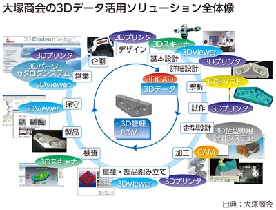 大塚商会の戦略は、3Dプリンタだけでなく、3DCADやCAM(コンピュータ支援製造)、CAE(設計・開発工程支援システム)、3D金型専用設計システムなど含めた3Dデータ関連ソリューションをトータルで提供するというものだ。実は、3Dプリンタは装置だけ購入しても造形物を出力することはできない。出力するには、3DCADや3DCG、3Dスキャナによって作成した3Dデータが必要だからだ。従来から3Dデータ関連ソリューションを手がけてきた大塚商会は、「3Dプリンタが中心というよりも、むしろ3Dデータに着眼点を置き、企画から設計、加工、検査、保守などの製品展開のライフサイクル上で必要となるソリューションを提供している」(賀屋課長)。ユーザーは、3Dデータに関する必要な製品を大塚商会ですべて揃えることができるし、大塚商会にとっても案件単価を伸ばして、収益を拡大しやすくなるというわけだ。