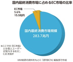 「EC」という言葉が知られはじめたのは、インターネットが本格普及し始めた1995年頃のことだ。以来、20年近くが経過してたったの5.6%に過ぎないのが現実である。だが、スマートフォンやソーシャルメディアが充実して以降の環境の変化は決して過小評価はできない。ECの専門家であるGMOメイクショップの向畑憲良社長は、「今後は日本の広告費のなかに占めるインターネット広告と同じ推移をたどるだろう」と話す。