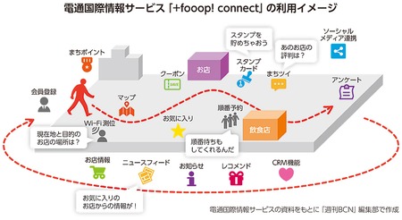 同社では「+fooop!」というソーシャルシティ・プラットフォームの研究開発を推進しており、2013年4月に開業した大型複合施設「グランフロント大阪」では、「+fooop!」プロジェクトの第一弾として“街のコミュニケーション基盤”サービスを提供している。「+fooop! connect」では、こうしたノウハウをパッケージ化したもので、昨年12月には東芝と川崎市が共同で行った「川崎駅前商業活性化実証実験」にも採用されるなど、着々と実績を伸ばしている。