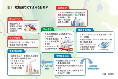 ●短期間での実現は難しい 石巻市でスマートシティの構築を担当しているのは、都市計画課ではなく、復興政策部に属する新産業創造課である。モデル地区でHEMSを装備した住宅を建てるという「第一弾」を経て、今後は市全体でスマートシティを構築し、新しい産業をつくり出す構想が動きだしている。