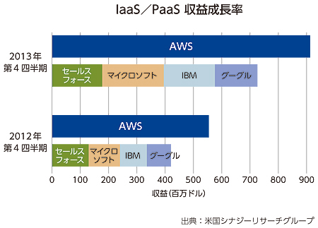 米国調査会社のシナジーリサーチグループが2月3日に発表した2013年第4四半期のIaaS/PaaS市場調査によると、「マイクロソフトとIBMの急激な追い上げにもかかわらず、AWSはIaaS/PaaS市場の支配的なリーダーである」としている。同調査によると、マイクロソフトとIBMの売上高は前年比約50%増だが、AWSは約65%増だ。AWSのマーケットシェアは30%を超えている。