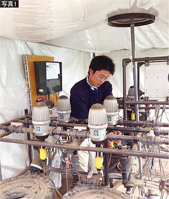 2012年までは、センサによって取得した環境データをモニタリングすることにとどまっているITソリューションが多かった。しかし、2013年に入って、実際に環境を制御することができるものが生み出されてきた。例えば、NECが提供している「農業ICTクラウドサービス」は、2013年7月に、あらかじめ設定したスケジュールに合わせて灌水制御ができる機能を追加。クラウドを経由して、ハウス内に設置した灌水装置を1日のうち何時から何時まで動かすのか、どの程度の間隔で水やりをするのかなどの詳細な設定を、1日48パターンまで遠隔で行うことができる。これによって、農家はハウスに足を運ぶ頻度を減らして、農作物を容易に栽培できるようになる。千葉県の農事組合法人である和郷園では、実際にこの灌水栽培の制御機能を利用して、従前よりも農作物の品質の安定・向上を実現している(写真1参照)。同様に、神奈川県のルートレック・ネットワークスも、養液栽培を制御できるソリューションとして「ZeRo.agri」を提供している。こうした栽培方法までに踏み込んだIT活用によって、農作業は劇的に変化していく。