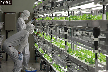 ITベンダー自らが生産者になる動きもみられる。富士通では、今年1月、福島県会津若松市に、4億円を投資して「Akisai」を活用した完全人口光型の植物工場「会津若松Akisaiやさい工場」(写真2)をオープンした。富士通がもともと半導体工場として使用していた施設のクリーンルーム2000m2を活用して、レタスなどの低カリウム野菜を1日あたり3500株ほど生産する。富士通の狙いは、「Akisai」のノウハウの蓄積と販売促進にある。自らが植物工場を手がけることで、他業種から新規参入する農家に対して、農業で必要となる施設や装置、クラウドサービス、生産ノウハウなどをまとめて提案することができるようになる。農業への新規参入を検討する企業は、日立製作所や富士通に相談すれば、簡単に農作物の生産を開始することができるのだ。