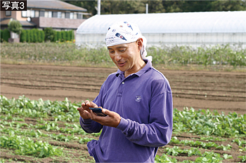一つの答えは、モバイル端末の活用にある。例えば、イーエスケイが提供しているAndroidアプリ「畑らく日記」がそれだ。これまで紙に記録していた営農日誌をスマートフォンで簡単に入力することができるというもの。露地栽培なので、温度や湿度などの環境そのものを制御することはできないが、作物の種類や状態、数量のほか、与えた肥料などの栽培記録をとることで、安定生産に結びつけることができる。データはクラウド上に保存されるので、紙の営農日誌と比べて長期に使うことができるし、過去の栽培履歴を参照すれば、品質を高めるためのヒントがつかめるかもしれない。また、日々の農作業で、広い圃場を見て回りながら音声入力もできるので、農業従事者は家に帰ってから日誌に記入する必要がないことになる(写真3参照)。